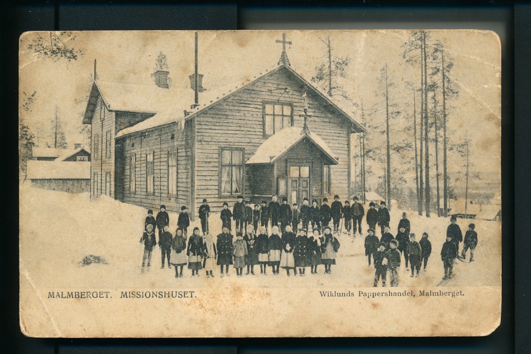 1. Malmbergets Missionshus var troligen första Missionshuset i Malmberget´s historia? Ett unikt foto/vykort och huset har troligen stått på det gamla sk ”Engelska området”? Jag har pratat med gamla Malmbergare och ingen känner till detta hus.Troligen försvann det tidigt?? kanske i samband med att den nya ” Mission´s kyrkan byggdes år 1907″? men detta är bara spekulationer från min sida! Kanske någon hemsidebesökare löser gåtan!??