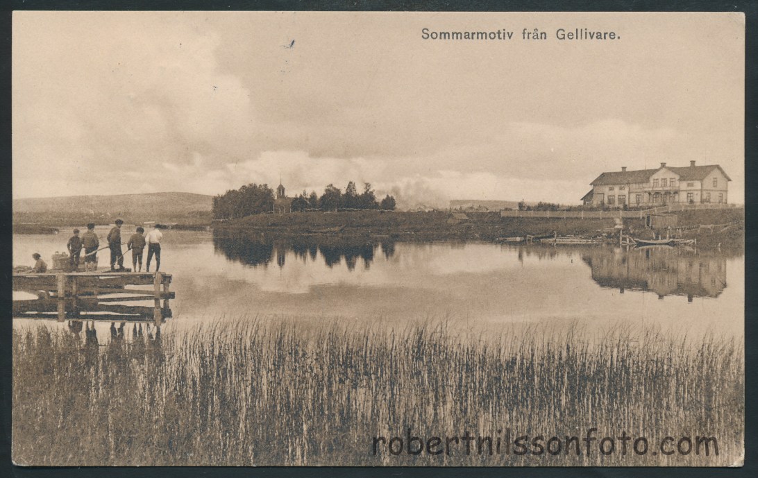 Lappkyrkan,Ett-öres kyrkan med klockstapeln,kyrkan byggde´s år 1747 och klockstapeln ca 20,30 år senare.Prästgården byggår 1800-tal skymtar till höger få vykorts vyn.Pojkarna på bryggan är belägen vid släkten Söderberg´s strand,här gick en gång i tiden en båt/färg-förbindelse över till Prästboställets strand.Prästbostället renoverade nyligen då hela fasden renskrapades till träet,och målades om i sin fina vita kulör(år 2011)fönstrerna byttes ochså ut till allmogefönster.Älven heter Vassaraälven och bosättningplatsen var pojkarna står heter ”Andra Sidan” och är i dag ett fint och attraktivt bostads område,med spår av den gamla kyrkbyggden Gällivare.Historik av Patrik Johansson 2013-03-18