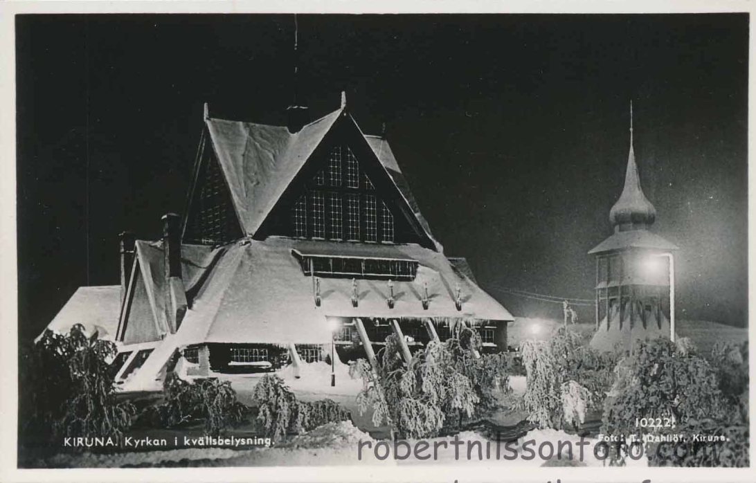 Kiruna Kyrkan i kvällsbelysning. PB 10222. Foto: T. Dahllöf. Ägare: Robert Nilsson
