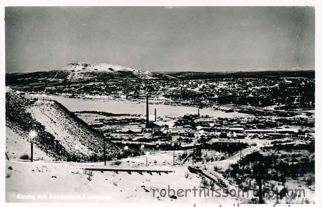 Kiruna och Luossavaara i månsken. Pressbyrån 1079. Ägare: Fjällviolen.