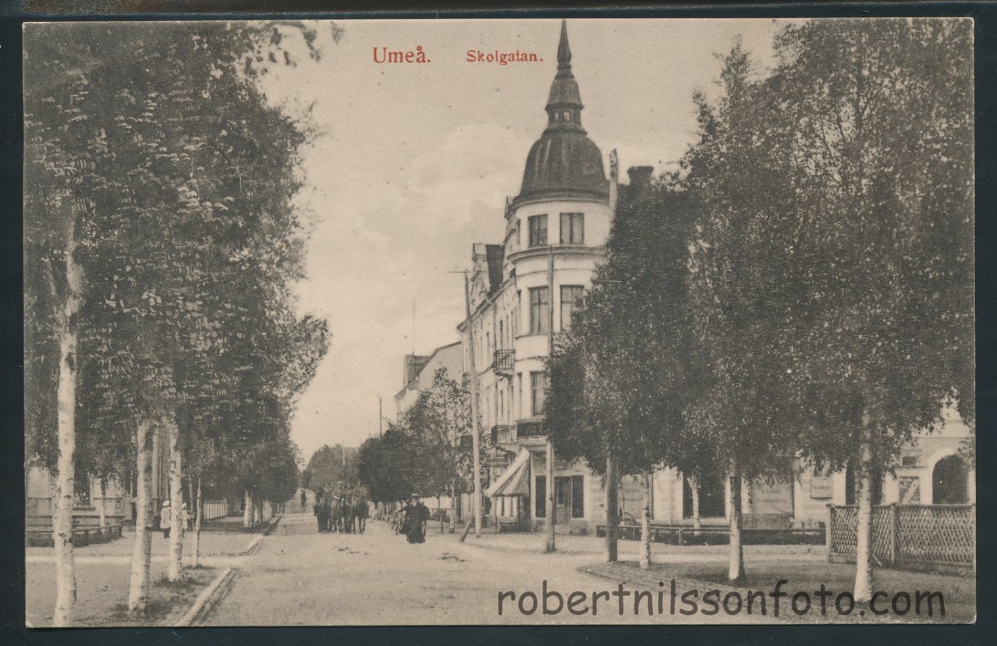Dragoner rider längs Skolgatan. Frankerat 1915. Ägare: Robert Nilsson