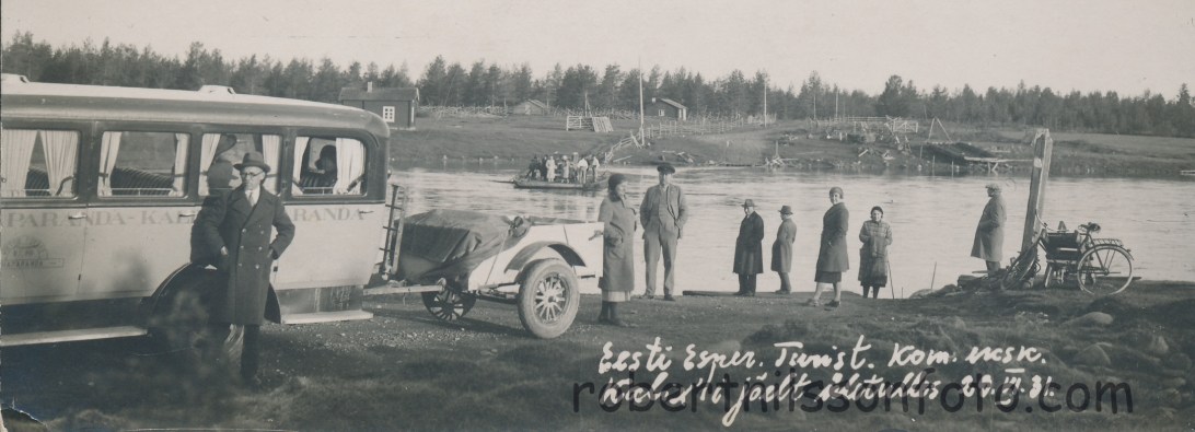 Buss o Färja över Kalix eller Torne älv 1931. Kanske färjeläget vid Autio, Pajala? Ägare: Bengt-Göran Nilsson.