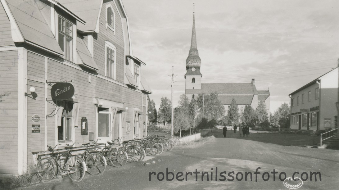 Bureå. Gatuparti med Kondis o cyklar. Frankerat 1948