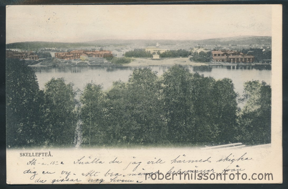 Stadshotellet och närmare i bild ser vi pumphuset som Brandkåren använde. Till höger Ångbryggeriet. Bilden är tagen från Sörböle över Skellefteå älv