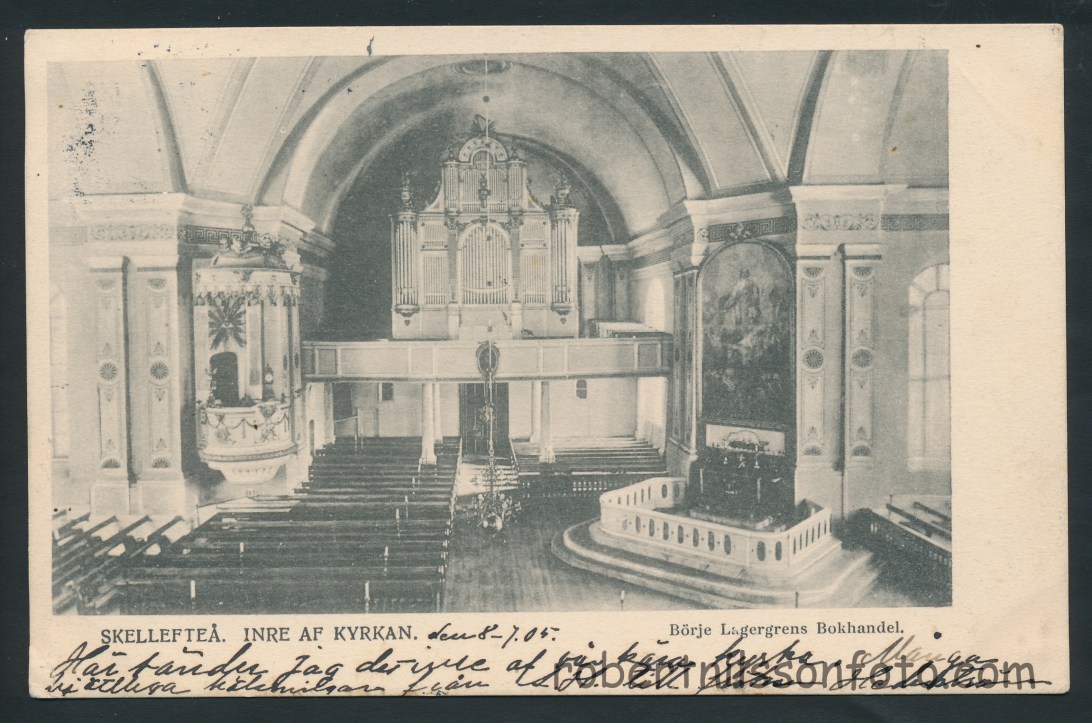 Skellefteå Inre af kyrkan. Frankerat 1905. Ägare: Robert Nilsson