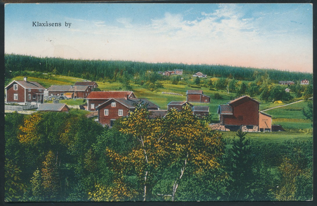 Klaxåsens by ca 1920-tal. Frankerat 1943. Vykortsskrivaren verkar ha bott i Keckas hus, se krysset på framsidan.
