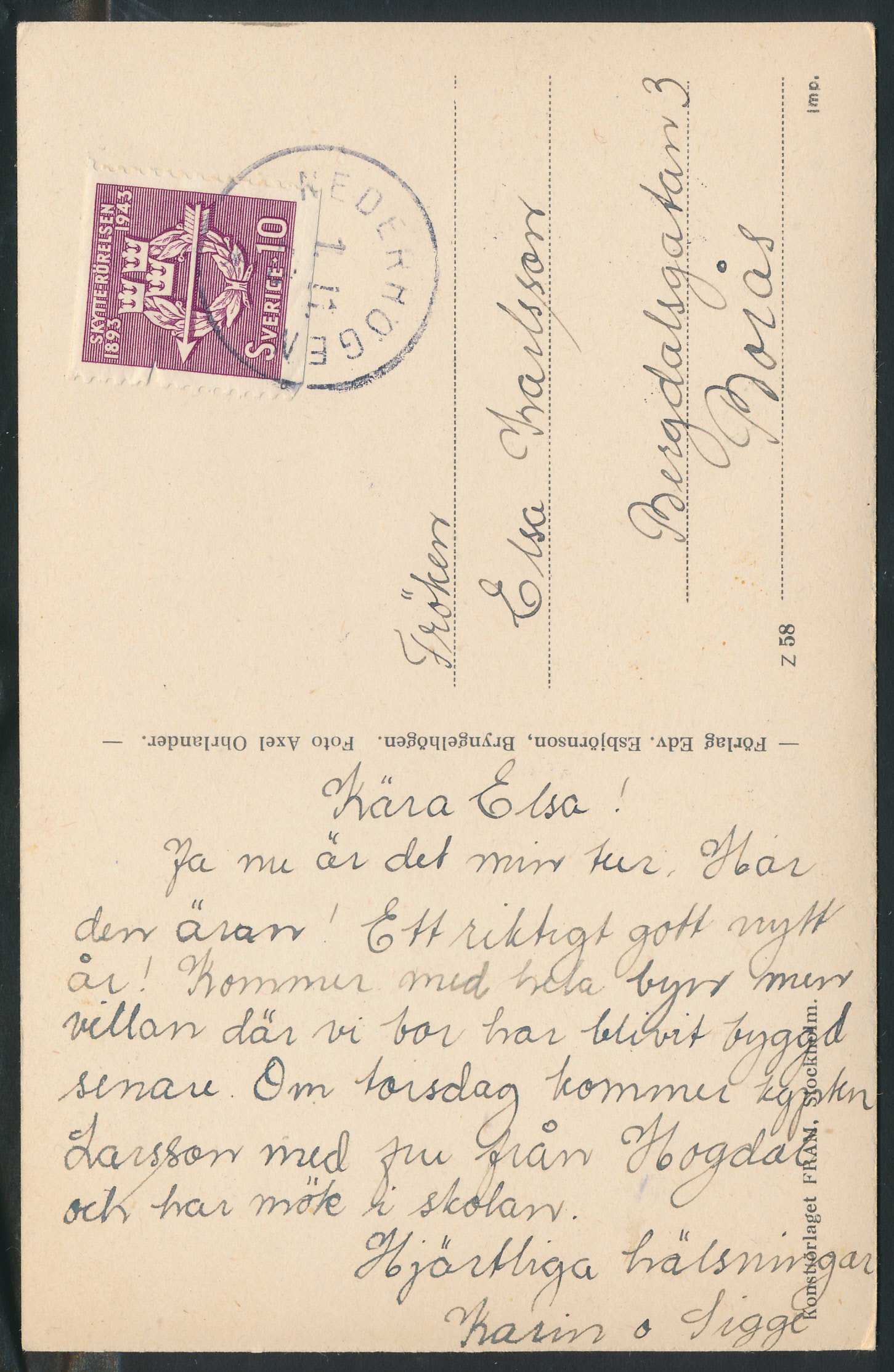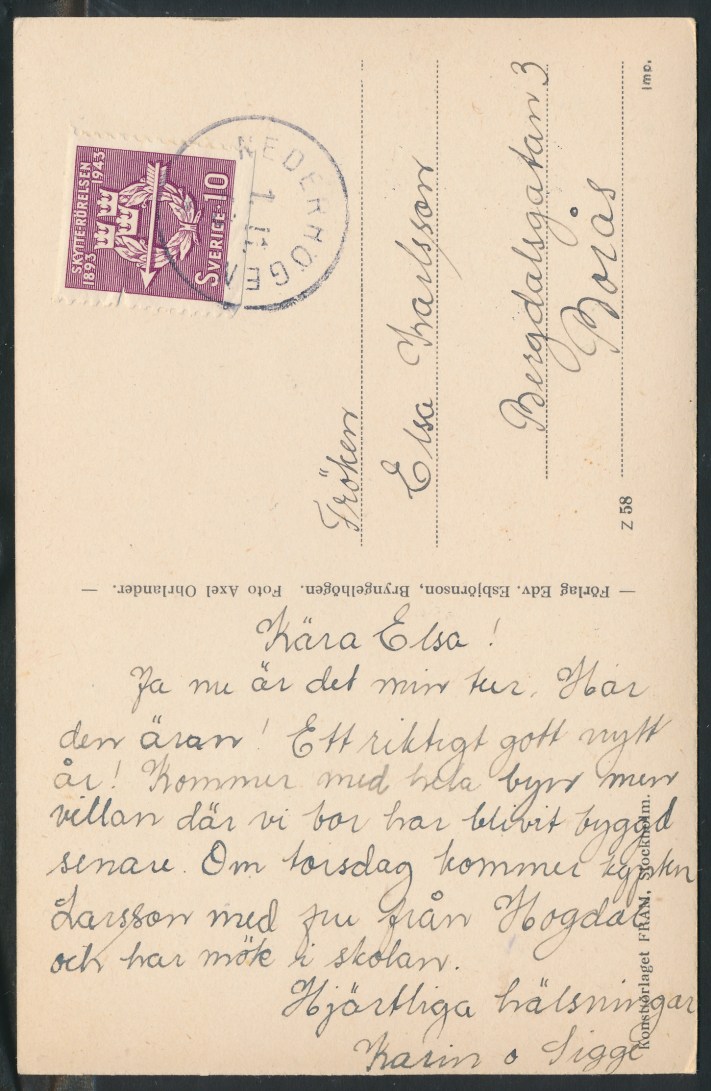 Klaxåsens by ca 1920-tal. Frankerat 1943. Vykortsskrivaren verkar ha bott i Keckas hus, se krysset på framsidan.